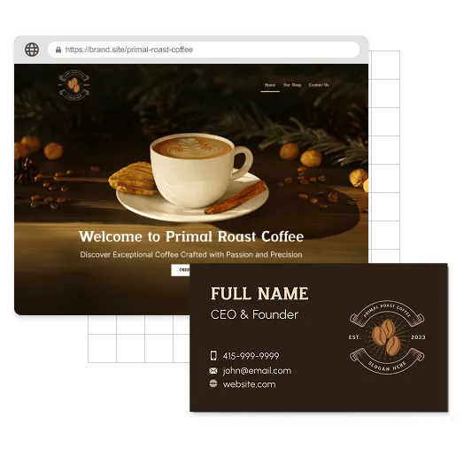 Once your logo is ready, bring your entire brand to life with Design.com’s AI-powered tools. In just a few clicks, you can turn your logo into a professional website, eye-catching business cards, and a cohesive brand kit — all perfectly aligned with your brand identity.